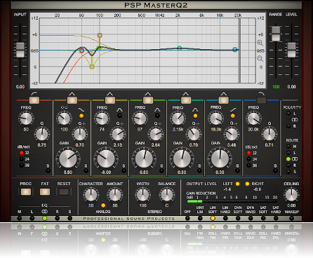 PSP MasterQ2 kann bei Abtastraten von 44,1 kHz bis zu 768 kHz betrieben werden. Es bietet sieben verschiedene Filter: 12, 24 und 36 dB/oct Tiefpass- und Hochpassfilter; Tiefshelf- und Hochshelf-Filter, die in Peak-Filter umgeschaltet werden können; sowie Tiefmitten-, Mittel- und Hochmitten-Peak-Filter - alle mit einstellbarer Frequenz und Q über einen weiten Bereich.