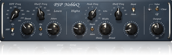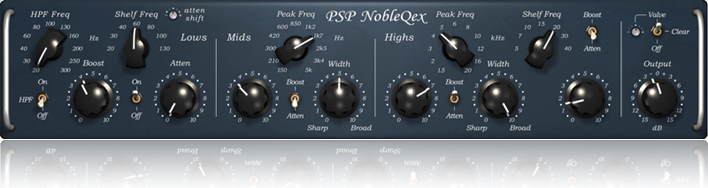 PSP NobleQex ist eine erweiterte Version des PSP NobleQ. Es bietet alle Funktionen des PSP NobleQ kombiniert mit einem zusätzlichen Mittel-Bell-Filter und einer einstellbaren Frequenzverschiebung für den Low-Shelf-Dip.