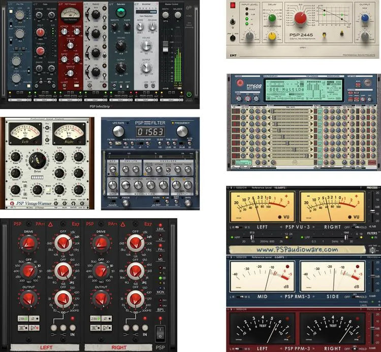 PSP Audioware hat sich einen Namen als eine der angesehensten Quellen für hochwertige Plug-ins und Software gemacht. Mit dem PSP Audioware Signature Plug-in Bundle erhalten Sie alle ihre meistverkauften Plug-ins auf einmal, was Ihnen das perfekte All-in-One-Werkzeug bietet, um Ihre Produktion auf professionelle Ergebnisse zu bringen. Das InfiniStrip Plug-in ist für viele verschiedene Anwendungen nützlich und bietet eine benutzerfreundliche Organisation für Preamps, EQs, Kompressoren und mehr mit viel Vielseitigkeit. Als Kompressor und Limiter zugleich bietet VintageWarmer2 die Art von reichhaltiger und warmer analoger Verarbeitung, die Sweetwater-Ingenieure im Studio verlangen, und das 3-Band-EQ des E27 Plug-ins ermöglicht es Ihnen, Ihren Sound bis zur Perfektion zu formen. Der 2445 EMT und der 608 Multi Delay gehören zusammen und bieten den Klang klassischer digitaler Hallgeräte und endlose Delay-Optionen. Abgerundet wird das Ganze mit stompFilter für zahlreiche Filteroptionen und TripleMeter für eine einfache Audioüberwachung, und Sie erhalten ein vollwertiges Plug-in-Bundle, das darauf ausgelegt ist, das Beste aus Ihren Projekten herauszuholen.