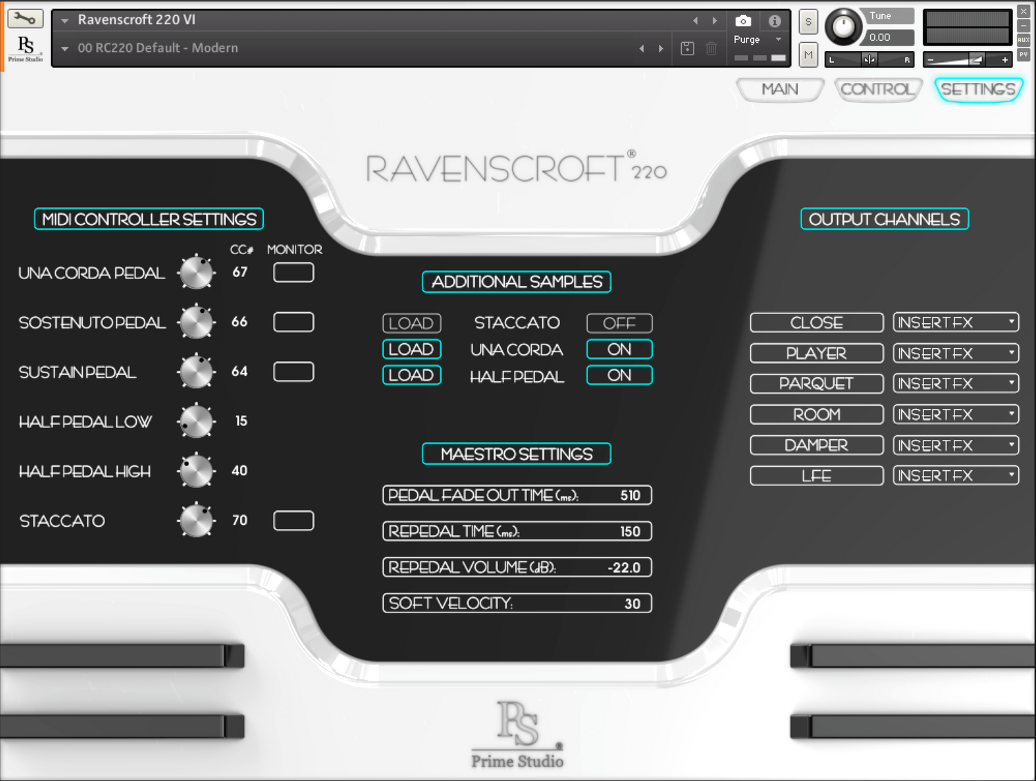 Das virtuelle Instrument bietet echtes Sustain-Pedal-Sampling, Aktionen und Pedalgeräusche, die auf kontinuierliche MIDI-Controller für Una Corda, Sostenuto und Sustain-Pedal-Nutzung reagieren. Mischen Sie vollständig gesampelte sympathische Resonanzen mit der Funktion „Harmonics“. Sechs verschiedene Positionen bieten 11 Mikrofon-Signale, um Ihren Lieblingssound zu mischen. Die Wahl von „Parquet“ und das Mischen der „LFE“-Mikrofonposition in Verbindung mit der Verwendung von Stereo-Kopfhörern bietet Ihnen ebenfalls ein binaurales Hörerlebnis. Für experimentelle Spieler bietet das Ravenscroft 220 VI auch Staccato-Samples.
