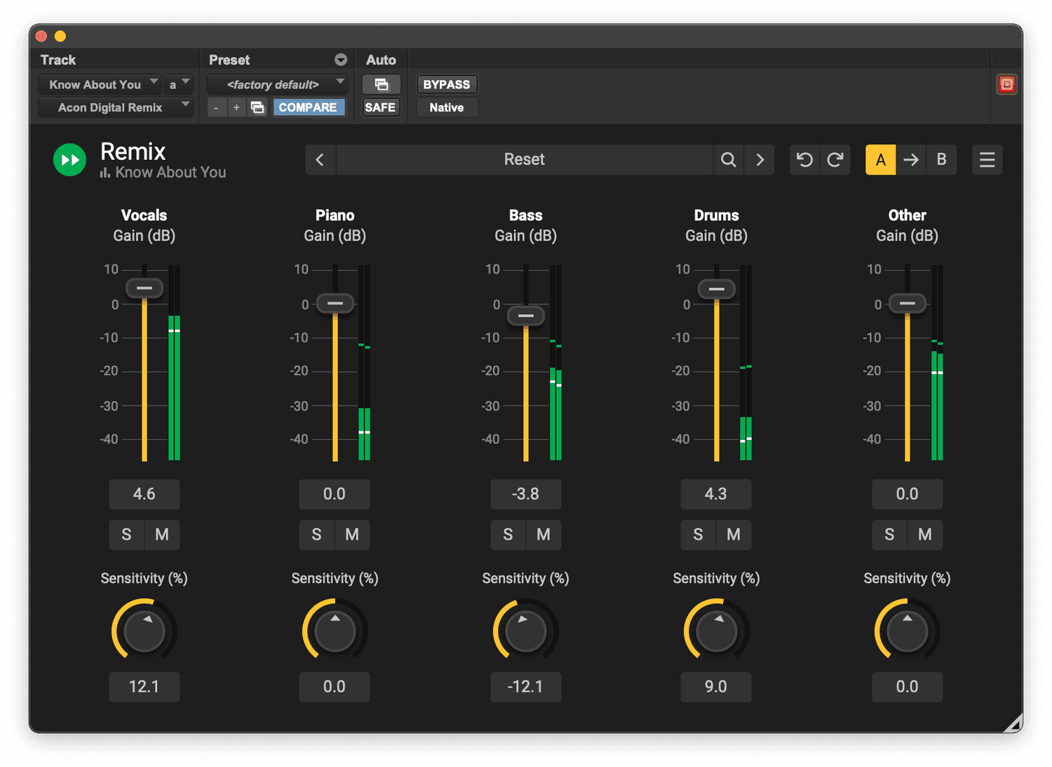 Mit vollständig automatisierbaren Parametern ermöglicht Ihnen Remix, die Empfindlichkeit jedes Stems fein abzustimmen und das perfekte Gleichgewicht zwischen Klarheit und Spill zu finden. Erhöhen Sie Ihren Sound mit Remix und entdecken Sie endlose kreative Möglichkeiten!