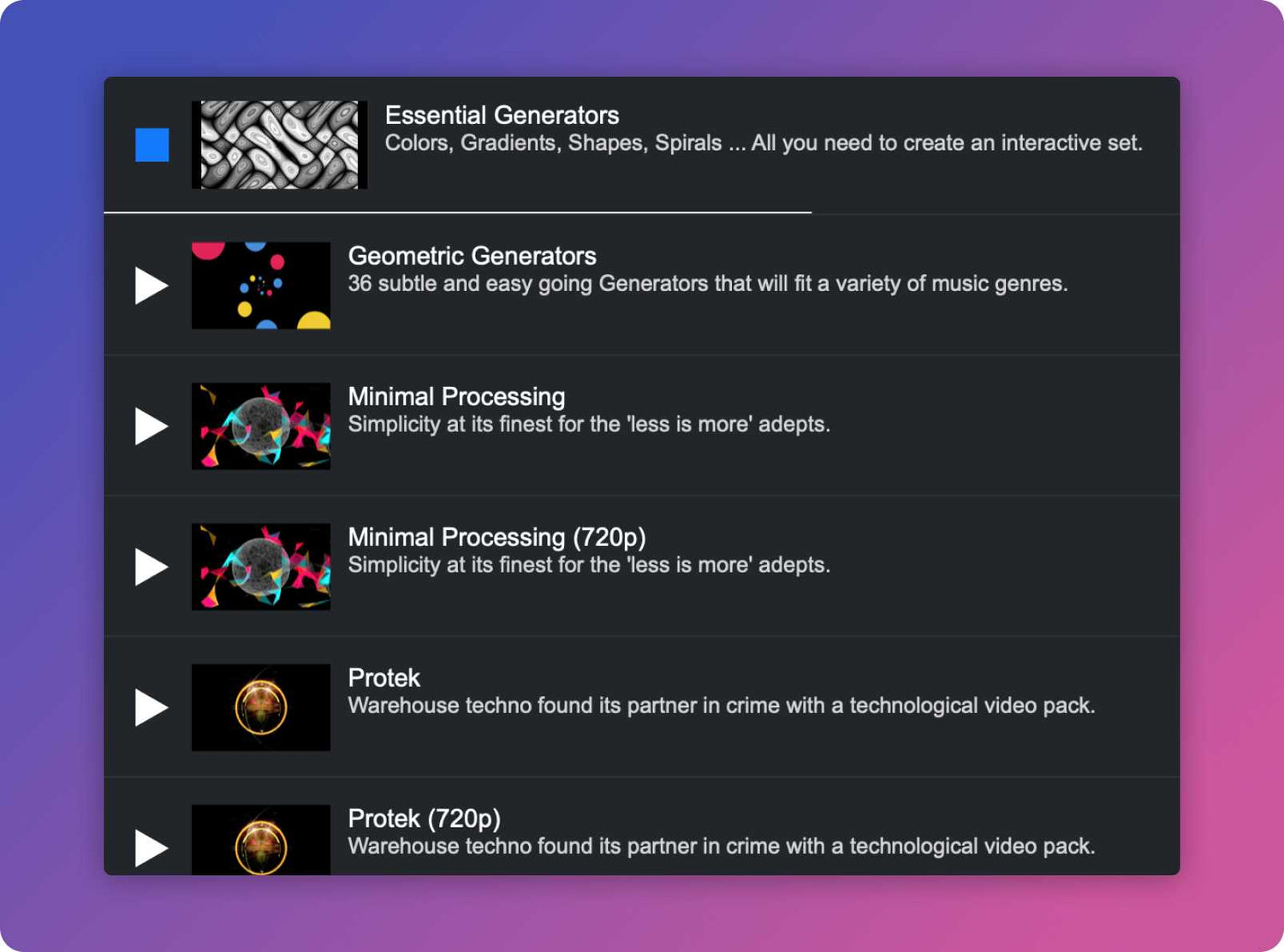 • 144 lizenzfreie professionelle Videobeispiele (verfügbar in 404p, 720p und 1080p) • 36 lizenzfreie professionelle Audiobeispiele • Generatoren: Enthält 48 in Echtzeit generierte und audio-reaktive GLSL-Dateien • Overlays: Enthält 13 Videobeispiele mit transparentem Hintergrund