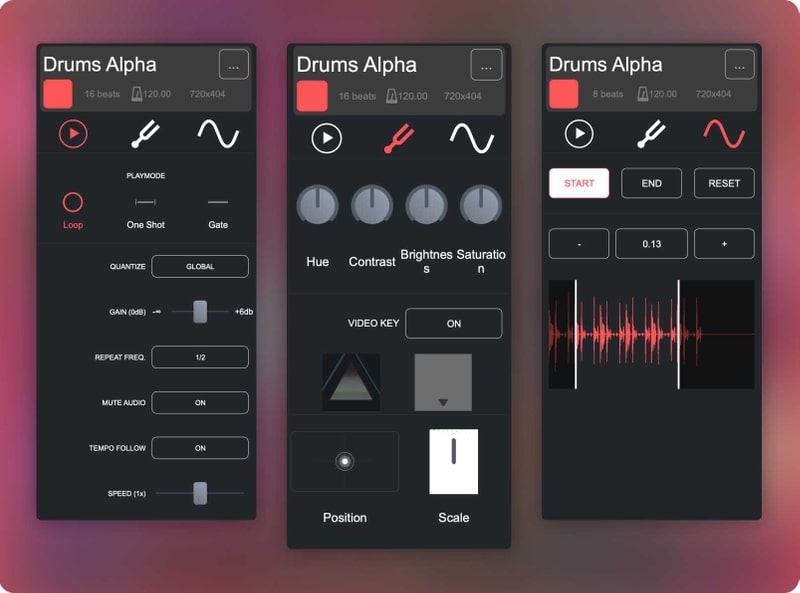 • Vollständig synchronisierte Videobeispiele abspielen: Audiobeispiele mit Videopads verknüpfen • Modulares Raster: bis zu 8×8 Pads • Importieren Sie Ihre eigenen Video- und Audiobeispiele in das Raster • Audio-Editor: Quantisierung, Verstärkung, Stummschaltung • Video-Editor: Farbton, Kontrast, Helligkeit, Sättigung, Tonwertkorrektur, Position und Seitenverhältnis • Bildsteuerung: Videoprojektionsmapping und Master-Videoeditor • Direkte Ausgabe auf einen zweiten Bildschirm für Live-Auftritte • Nehmen Sie Ihren Auftritt live in hochwertigem MP4-Video auf