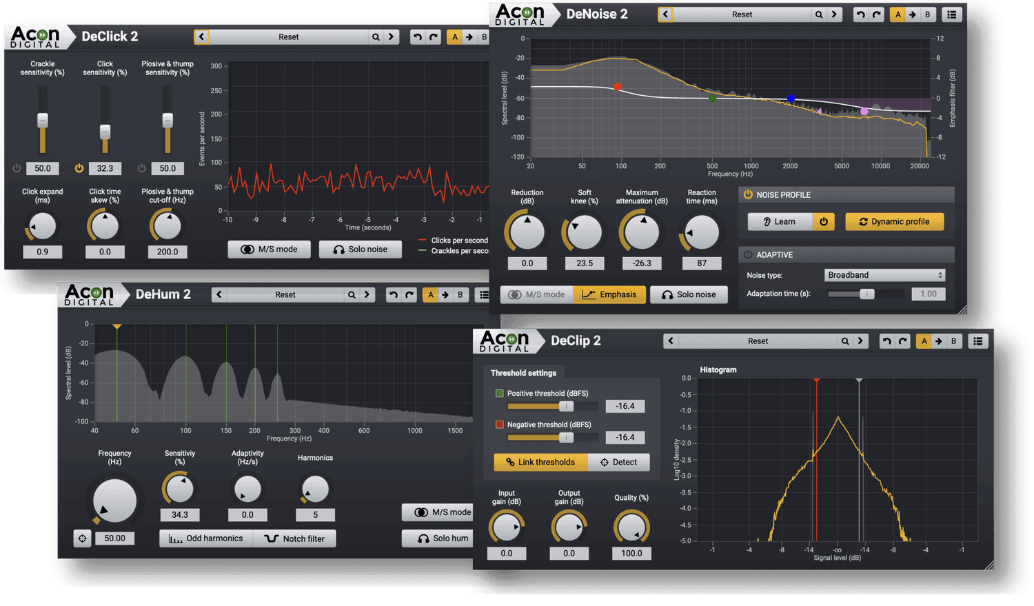 Entdecken Sie unsere Restoration Suite, eine bahnbrechende Sammlung von vier fortschrittlichen Audio-Restaurierungs-Plugins, die darauf ausgelegt sind, Ihren Aufnahmen neues Leben einzuhauchen! Egal, ob Sie mit Rauschen, Windgeräuschen, Brummen, Summen, Klicks oder anderen unerwünschten Geräuschen zu kämpfen haben, diese Suite hat die Lösung.