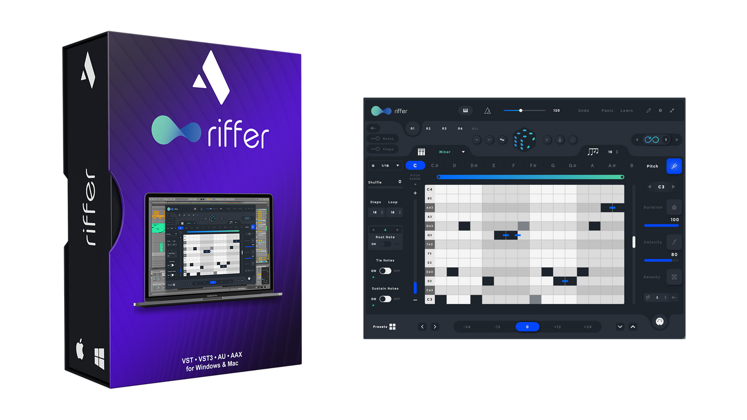 Wir präsentieren „Riffer“, ein intelligentes MIDI-Tool, das musikalische Riffs und Sequenzen durch die Kombination von Tonhöhe, Dauer, Anschlagstärke und Dichte erzeugt. Es kann unendlich viele zufällige Riffs generieren.