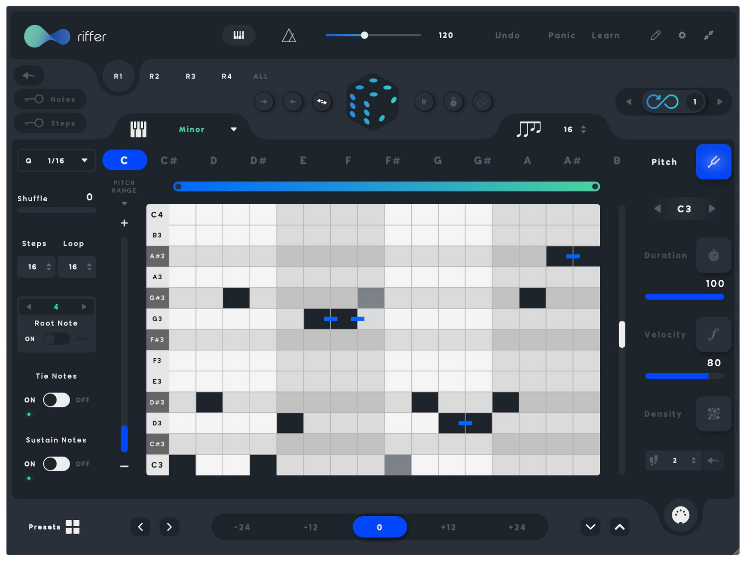 Riffer ist ein intelligentes MIDI-Tool, das musikalische Riffs & Sequenzen generiert, indem es Pitch, Duration, Velocity & Density kombiniert. Entwickelt für Ihre Sounds, Software & Hardware. Verwandeln Sie sie in etwas Eigenes oder lassen Sie es endlos im Infinity-Modus laufen.