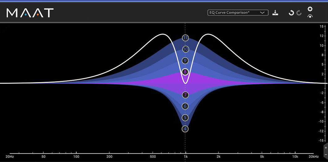 1. Alle 12 Equalizer-Architekturen sind normalisiert, um genau die gleiche Glockenform bei 6 dB Anhebung zu haben. Wenn Sie nur einen Glockenfilter bei +6 dB verwenden, erhalten Sie für alle Typen das gleiche hörbare Ergebnis. Diese Normalisierung des Q oder Qualitätsfaktors ist ein einzigartiges MAAT-Feature und unterscheidet unsere Typologien von ihren analogen Vorläufern, da viele der Originale aufgrund der Einschränkungen der analogen Technologie undefinierte Q-Definitionen haben. Die Normalisierung ermöglicht es Ihnen, die verschiedenen EQ-Architekturen in SantaCruzEQ mühelos zu vergleichen.