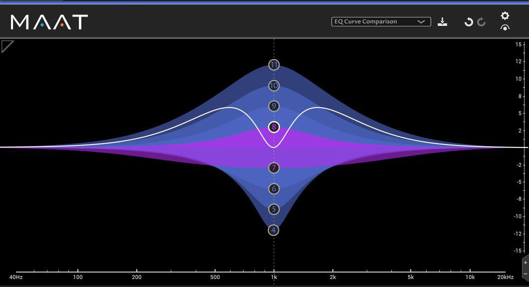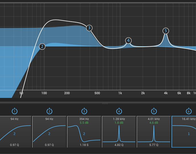 - Six Sections total, with four having freely assignable parametric filter variants: bell; multi–order high & low shelf; multi–order high & low cut.