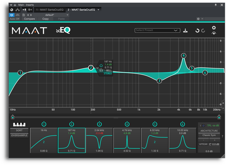 SantaCruzEQ6 ist die sechs Architekturversion von SantaCruzEQ12. Die Architekturen Nr. 1-6 sind alle in Serien-Topologie und bieten einen hervorragenden Einstieg in die akustische Welt unserer Equalizer. Vier voll ausgestattete Abschnitte sind verfügbar, zusammen mit zwei Abschnitten von Regalen und Schnittfiltern.