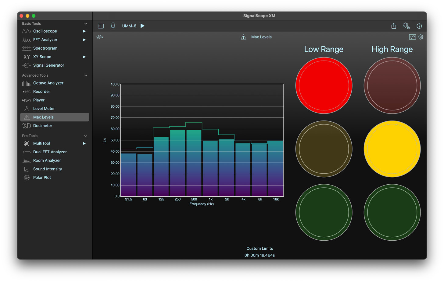 Der Advanced Tool Set von SignalScope XM umfasst den Zugriff auf eine Suite von grundlegenden und fortgeschrittenen Analysewerkzeugen sowie spezialisierte Hardwareunterstützung, wie z. B. das automatische Laden von werkseitig gelieferten Mikrofonempfindlichkeiten für ausgewählte USB-Mikrofone, aktualisierte nominale Spannungsempfindlichkeiten für ausgewählte Audioeingabegeräte und automatische Kalibrierung für Audioeingabegeräte, die integrierte Empfindlichkeitsinformationen enthalten.