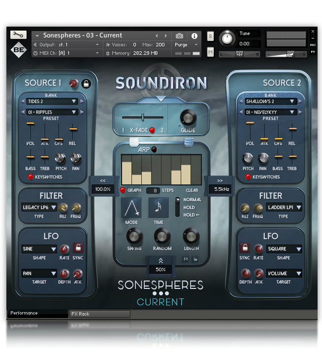 Unsere intuitive Benutzeroberfläche bietet Ihnen flexible Steuerungsfunktionen für zwei unabhängige Sample-Quellenmodule, mit Kategorien- und Preset-Auswahlmenüs für jedes. Beide Module bieten automatisierbare Steuerungen für Lautstärke, Anschlag, Startversatz, Release, Bass, Höhen, Tonhöhe, Panorama, Filtertyp, Filterresonanz, Filterfrequenz, LFO-Form, LFO-Rate, LFO-Tempo-Synchronisation, LFO-Zielparameter, LFO-Tiefe und LFO-Anschlagszeit. Der LFO kann auf Lautstärke, Bass, Höhen, Tonhöhe, Panorama, Resonanz und Frequenz geroutet werden. Es gibt auch einen Crossfader, ein Legato-Glide-System und ein schrittsequenzierbares Arpeggiator-System sowie unser vollständiges FX-Rack-System, das es Ihnen ermöglicht, aus 18 kreativen Effekt-Plugins auszuwählen, einschließlich Convolution Reverb mit über 100 unserer Lieblings-Impulse-Responses für Reverb, die alles von Bunkern und wellenförmigen Sci-Fi-Effekten bis hin zu Klavierseiten und Konzertsälen abdecken.