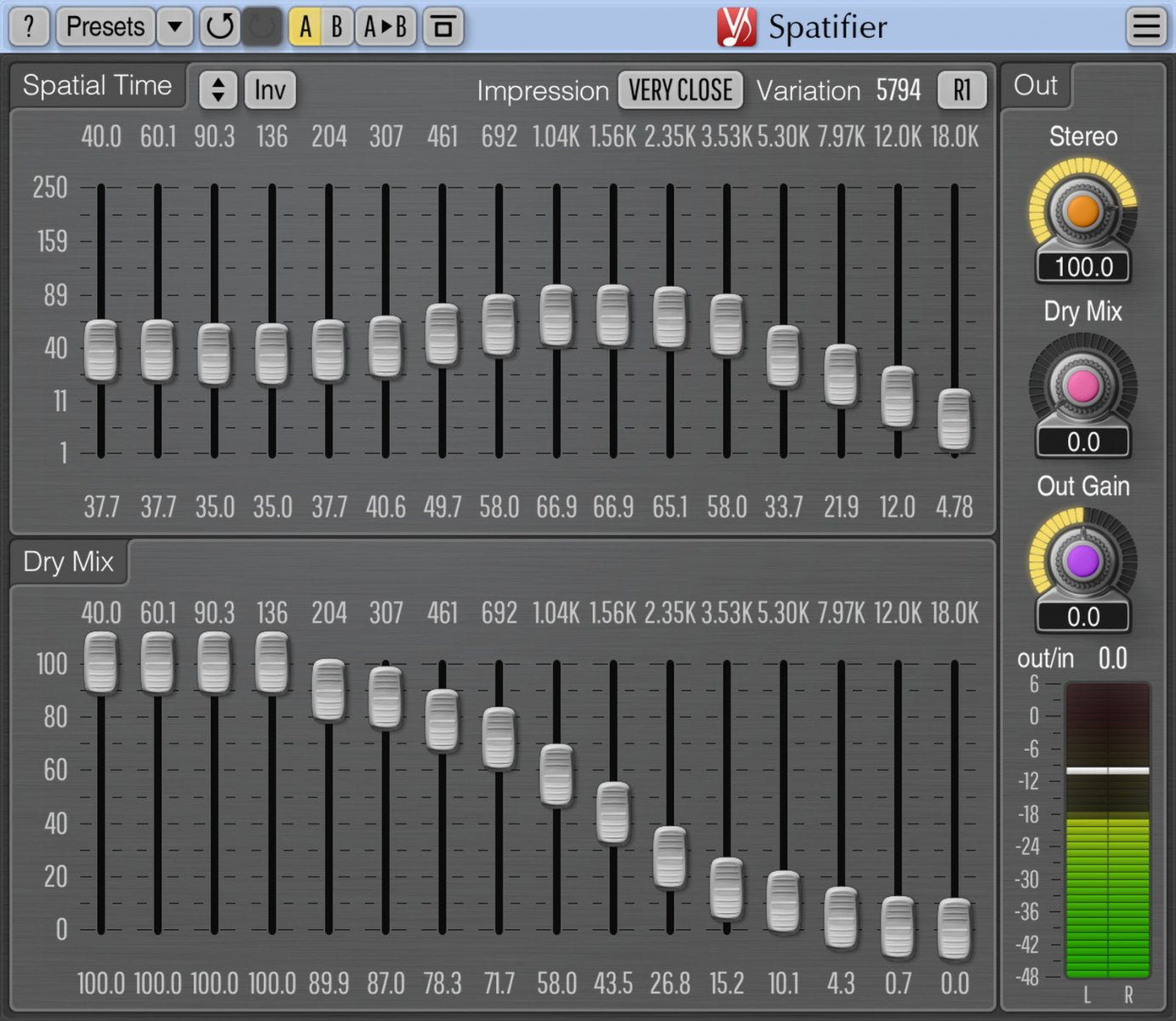 Spatifier achieves its result by first designing a complex impulse response that is then used by its internal convolution processor. The impulse response is defined by means of graphic equalizer-like controls (which can be adjusted in a freehand mode with the right mouse button). This makes it possible to set the spatial effect for each frequency band individually. In many practical cases Spatifier adds a great deal of warmness and enriches the timbre of the sound being processed.