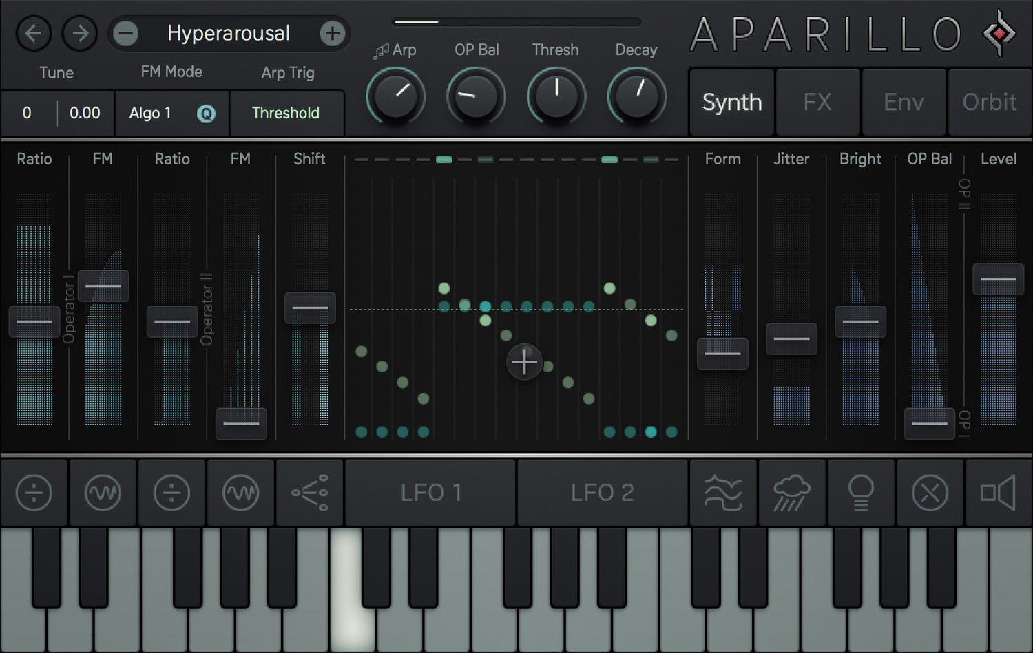 Aparillo ist ein fortschrittlicher 16-stimmiger FM-Synthesizer, der für majestätische Klangbewegungen maßgeschneidert ist. Eine clevere Anordnung von Synthese, Wellenformgestaltung, Filterung, FX und Modulation entfaltet sich zu einem ernsthaften Sounddesign-Tool für epische Klangkreationen. Vergessen Sie nicht, den Orbiter auszuprobieren, einen Massen-Controller für sofortige, blockbusterartige Themen.