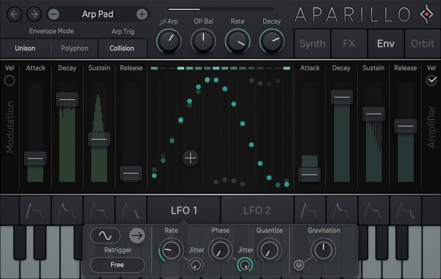 Die Hüllkurven zeigen benutzerdefinierbare Steigungen, Loop-Modi und polyphone Parameter-Modulation. Der duale komplexe LFO bringt einige Spezialitäten wie FM, Gravitation, Oneshot, S+H/Quantize und den wunderschön chaotischen Collision Mode mit.