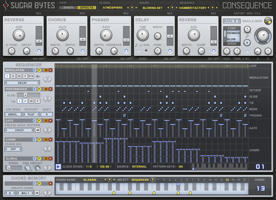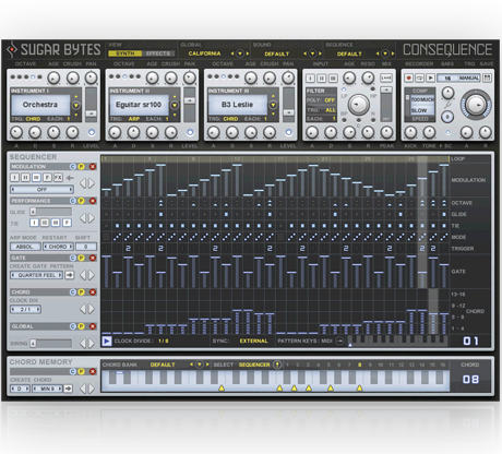Consequence ist ein Arpeggiator, der eine Folge von Noten basierend auf den Akkorden erstellt, die Sie bereitstellen. Es können bis zu 3 Instrumente geladen werden, und eine Vielzahl von Sequenzierungsoptionen kann verwendet werden, um die Art und Weise zu steuern, wie das Plugin Ihre Eingabe "interpretiert".