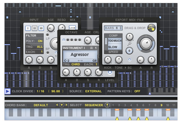 Die samplebasierte Soundbibliothek enthält alle Arten von Instrumenten – von leistungsstarken analogen Synthesizern bis hin zu subtilen Geigen, die jeweils Oktave-, Pan-, Level- und Crush-Regler bieten. Sie können für jedes Instrument unabhängig einen Trigger-Modus wählen, sodass es möglich wird, komplexere Sequenzen zu erstellen, indem einige Instrumente als Akkorde und andere als Arps ausgelöst werden.