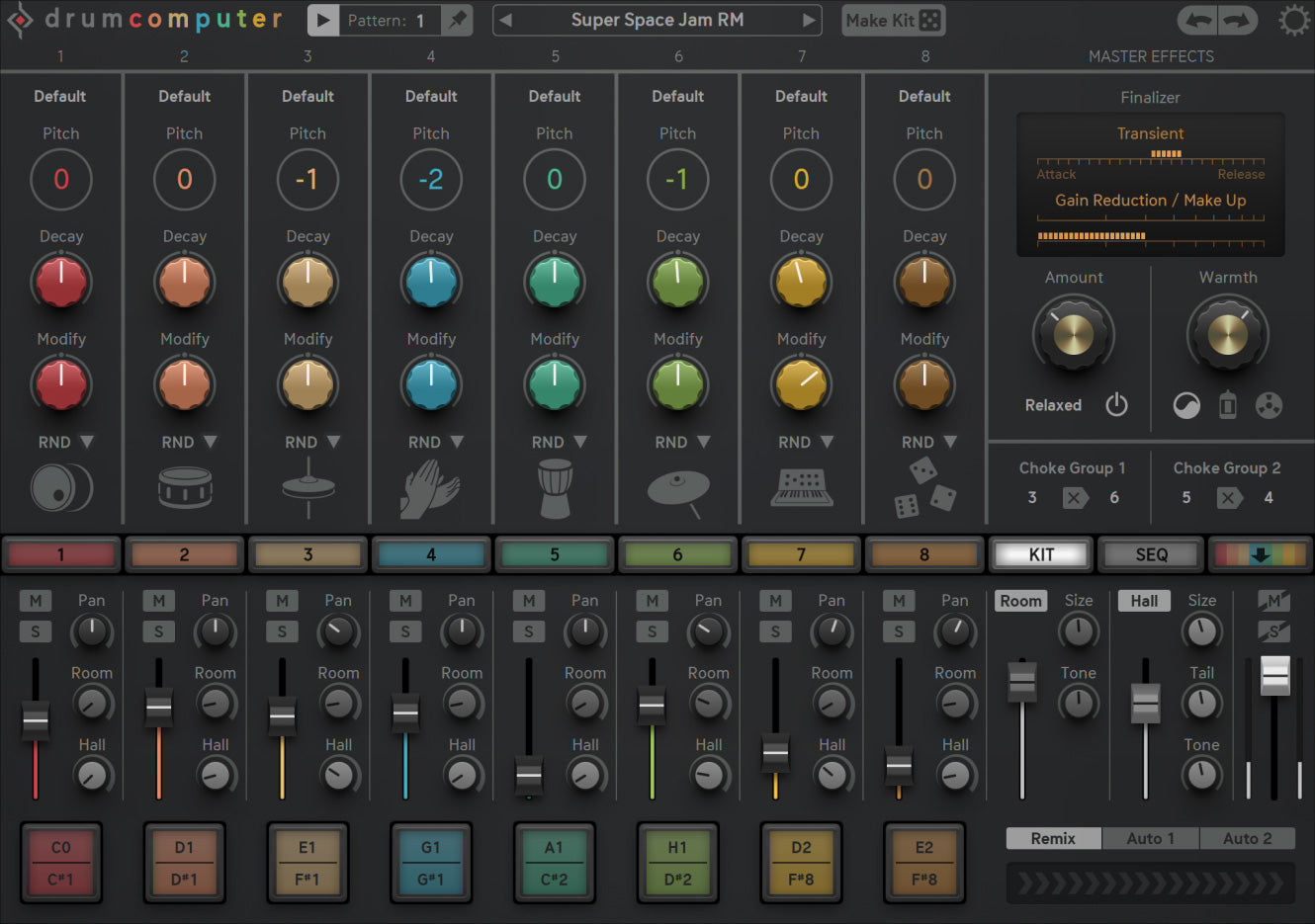Drum-Sound-Randomizer mit Profilen und der MakeKit-Taste werden dich weiterhin mit neuen Drum-Sounds und Kits überraschen. Einfache Patterns verwandeln sich mit der Auto Fill-Funktion in lebendige Tracks, die Fills und Parameteränderungen an bestimmten Songpositionen einfügt. Die revolutionäre Remix-Steuerung erzeugt verrückte Fills und bietet viel Groove und Spaß.