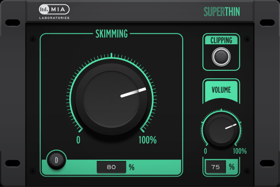 SUPER THIN is a One-Knob style plug-in resulting in a combination of Mia Lab's Musiqual Red, Musiqual Blue, Musiqual Green plug-ins and a final touch of Pi&Phi magic.