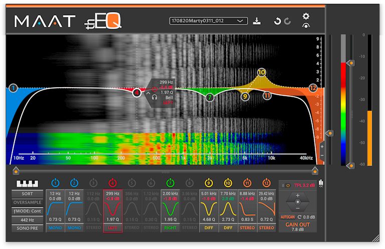 Die Idee wurde geboren, dieses Meisterwerk neu herauszugeben und als 64-Bit in allen gängigen Formaten und für macOS verfügbar zu machen. Eine Vereinbarung mit Algorithmix wurde getroffen, und MAAT wurde Mitte 2017 gegründet. Algorithmix-Fans hörten davon und kontaktierten uns mit den Worten: „…mach es einfach so, wie es ist; keine Extras, nichts. Wir wollen es einfach nur zurück in 64 Bit und für Mac.“ Das war ermutigend. Als Power-User hatte Tischmeyer einige andere Ideen bezüglich der Benutzeroberfläche im Kopf. Er wollte sie flexibler und schneller in der Nutzung gestalten, da es kein anderes Werkzeug in der Mastering-Kette gibt, mit dem ein Ingenieur so viel Einrichtungszeit verbringt. Das Ergebnis? „Ich denke, wir haben das erreicht. Die Benutzeroberfläche ermöglicht eine super schnelle Einrichtung und hat eine Reihe von einzigartigen Funktionen, die dabei helfen: Die positive & negative Contribution-Funktion einschließlich absoluter Differenz, das einstellbare Sonogramm, das das Erkennen von Energiepunkten, die man bereinigen möchte, erleichtert, und die Möglichkeit, einen Ton auf dem Klavier, das man im Kopf hat, zu spielen und einfach die jeweilige Frequenz mit einem Rechtsklick in den aktiven Bandbereich zu verschieben, sind nur einige der neuen Funktionen. Was mir auch gefällt, ist, dass ich einen Überblick über alle Abschnitte habe, im Gegensatz zu nur einem Abschnitt zur gleichen Zeit.“ Um nicht mit einer seltsamen Abschnittsreihenfolge zu enden, wenn man viele Filter verwendet, haben wir auch die SORT-Taste hinzugefügt, damit Ihre Abschnitte immer in aufsteigender Reihenfolge sind.