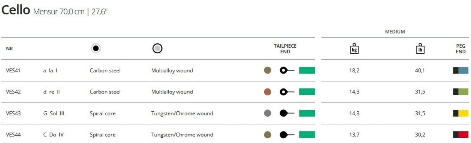 - D: steel wire core design, aluminium and plastic-coated copper winding, much thinner string diameter than conventional D strings, tension 14.3kg/31.5lbs