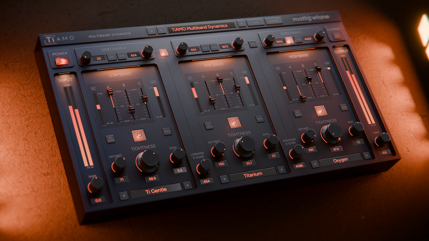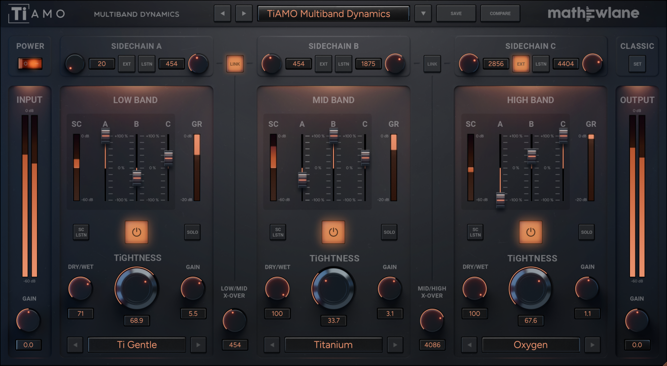 TiAMO is a one-of-a-kind multiband dynamics plugin, with 3 separate sidechains. Each band features powerful sidechain trigger mixing for organic and alive dynamics. From classic three band compression, over de-essing to musical pumping, advanced groove creation and more. All with easy to use TiCo based analog compressor models.