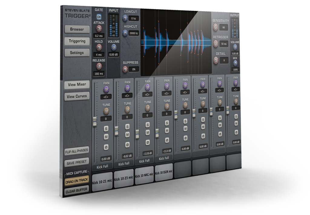 TRIGGER ist die nicht so geheime Waffe der Audioindustrie, um große, professionelle Schlagzeugklänge in Mischungen zu erzielen. Mit einer benutzerfreundlichen Oberfläche können Sie schnell Kicks, Snares und Toms in Ihren Aufnahmen mit einer riesigen Bibliothek professioneller Schlagzeug-Samples ersetzen oder ergänzen. TRIGGERs phasengenauer, mehrschichtiger Trigger-Engine ermöglicht es Ihnen, nahtlos 8 Stereo-Samples gleichzeitig auszulösen, wie z. B. ein Nahmikrofon-Sample, ein Stereo-Overhead-Sample und ein Stereo-Raum-Mikrofon-Sample. Oder mischen Sie viele Direktmikrofon-Samples, um Ihre eigenen benutzerdefinierten, einzigartigen Klänge zu entwickeln. Diese Mehrkanal-Trigger-Funktionalität ermöglicht es dem Benutzer, den Klang von natürlichen Schlagzeugen mit echten Multitrack-Samples nachzubilden. Jede Sample-Schicht hat Parameter zur Anpassung wie Anschlagsstärke und dynamische Kontrolle, Attack, Sustain, Release und unabhängige Pegel.