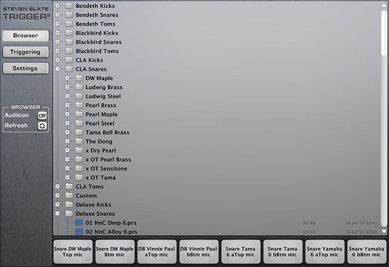 TRIGGER wird standardmäßig mit einer Bibliothek von branchenspezifischen Schlagzeug-Samples geliefert, die von Steven Slate erstellt wurden. Elite-Mischer wie Chris Lord Alge, Ross Hogarth, Justin Neibank, Dave Way, Jeff Juliano, Jay Baumgardner, Ben Grosse, David Kahn, Ryan Williams und viele weitere Top-Namen haben sich seit Jahren auf Slates Samples verlassen, um die Schlagzeugklänge in ihren Mischungen zu verbessern. Alle Samples in Trigger wurden auf 2-Zoll-Band aufgenommen und mit dem besten Vintage- und modernen Analog-Equipment verarbeitet. TRIGGER kann auch Erweiterungsbibliotheken wie Steven Slate Deluxe, Chris Lord Alge, Terry Date, Blackbird Studios und David Bendeth laden.