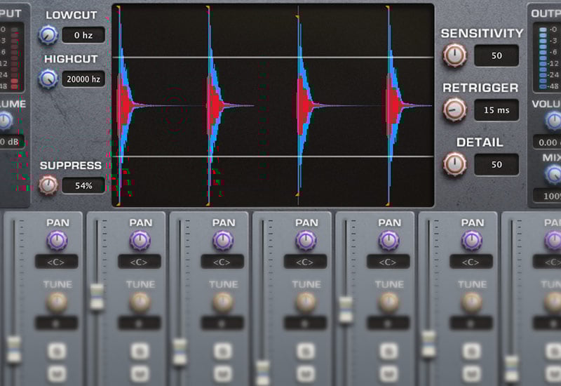 TRIGGERs proprietäre Leckageunterdrückung ermöglicht es Ihnen, Spill-Tracks an das Plugin zu senden, damit es die Leckage in einer Spur intelligent ignorieren kann, sodass Sie extrem niedrige Anschlagsstärke-Sample-Ersetzungen ohne Fehltriggerung erhalten.