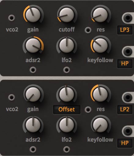 Wie die Oszillatoren sind die beiden Filter nach analoger Hardware modelliert und liefern zufriedenstellend analoge Ergebnisse. Sie können die Filter übersteuern, ohne harte Verzerrungen einzuführen, und die Resonanz bleibt intakt. Oder Sie können die Selbstoszillationsfunktion für chaotische Klangfarben und experimentelles Sounddesign nutzen.