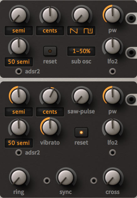 - Oscillators include pulse width modulation (PWM), sync, internal ring and cross modulation (FM)