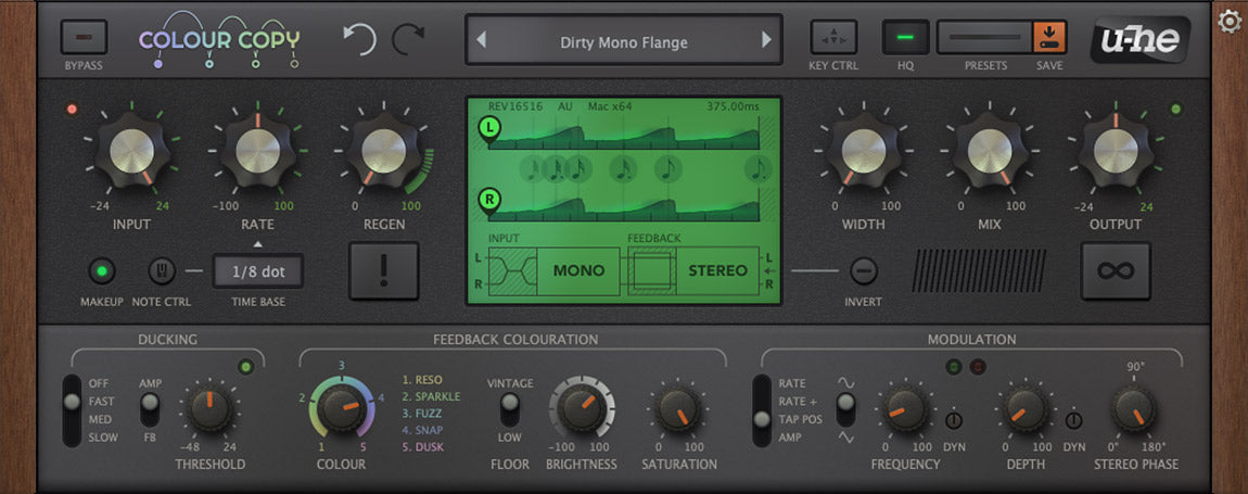 Colour Copy kommt mit dem obligatorischen Ducking-Kompressor, aber mit einer einzigartigen Wendung: Sie können auswählen, ob Sie das gesamte Delay-Ausgangssignal oder nur das Feedback-Signal ducken möchten. Diese letzte Option lässt das allererste Delay unbeeinflusst, wodurch der gesamte Stereo-"Raum" erhalten bleibt, während das akustische Chaos, das hohe Regeneration oft verursacht, verhindert wird.