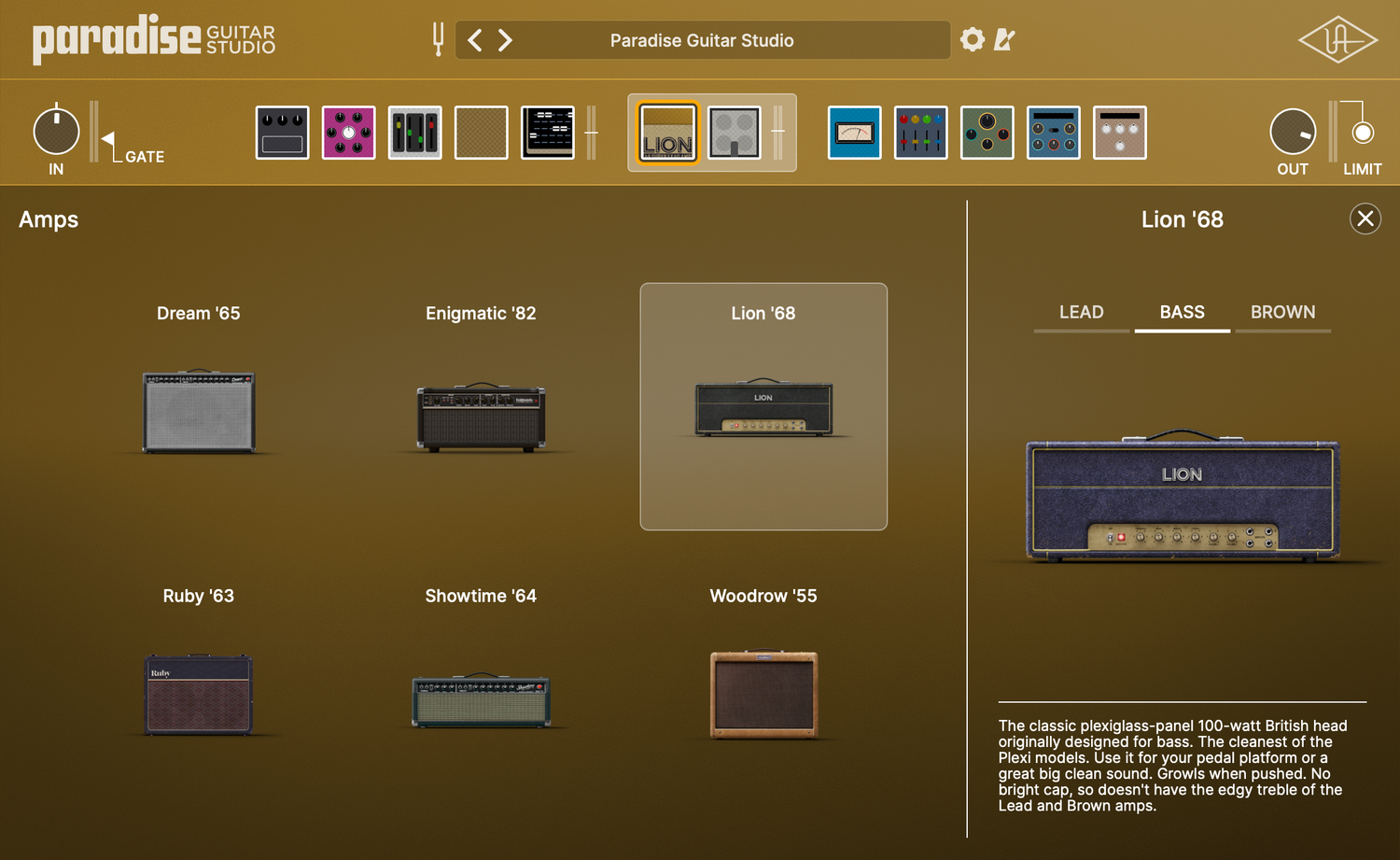 Mit unseren besten Amp-Emulationen – einschließlich der gefeierten UAD Dream ’65, Enigmatic ’82 und mehr – ist Paradise wie ein Raum voller ikonischer Geräte. Genießen Sie reiche Vintage-Klänge, mit all der Anschlagsdynamik und dem Röhren-"Sag", nach dem Profigitarristen sich sehnen. Egal, ob Sie jangly Cleans, natürlichen Overdrive oder seltene Boutique-Sounds benötigen, Sie können alles einstellen, was Ihr Track verlangt.