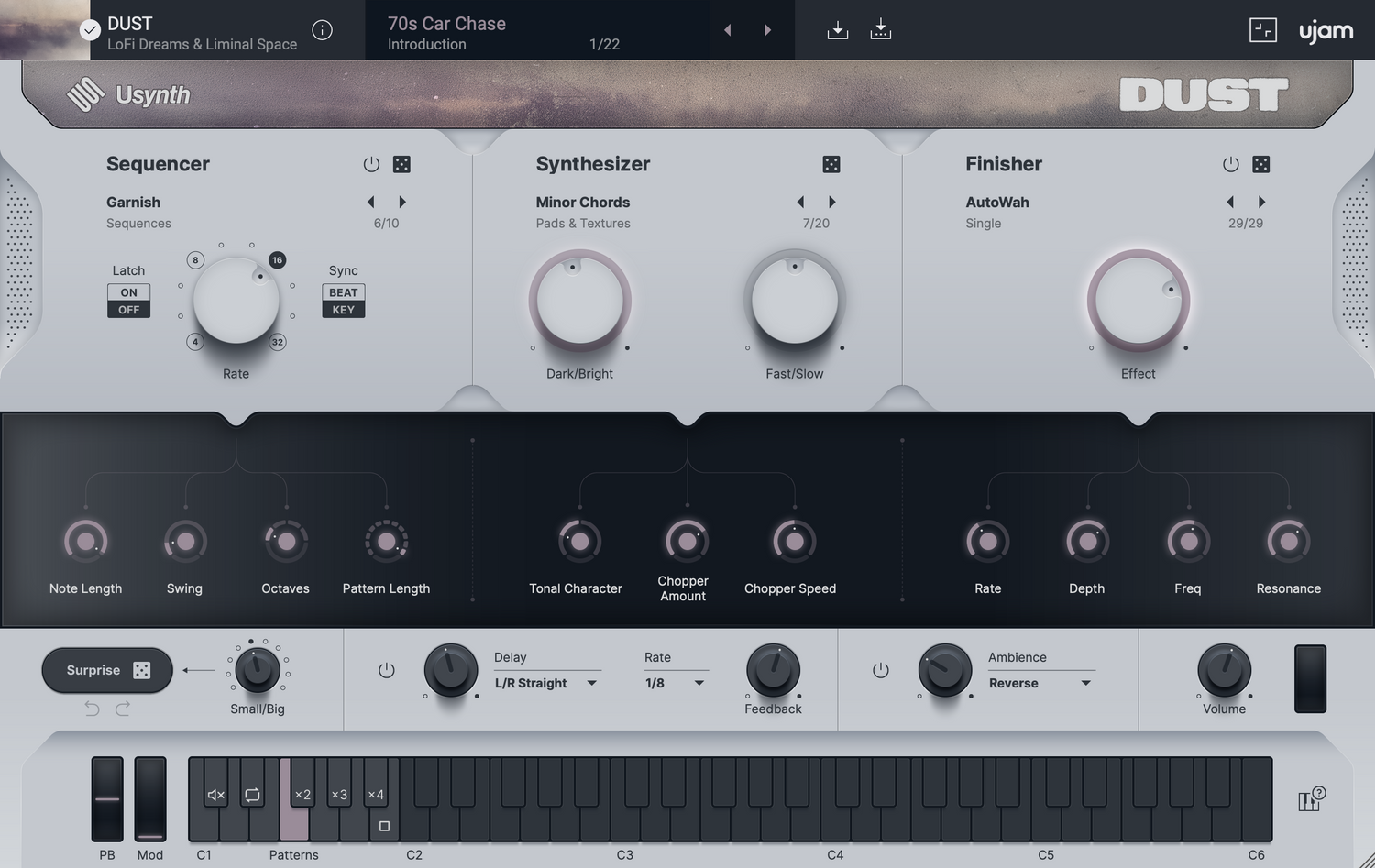 DUST dreht sich um wunderschön gealterte, staubige Töne. Es beginnt mit akustischen und elektrischen Instrumenten, dann werden sie degradiert, gefiltert und verzerrt zu über-retro liminal/loFi Perfektion — die Art von Charakter, die alles wunderschön abgenutzt und lebendig klingen lässt.