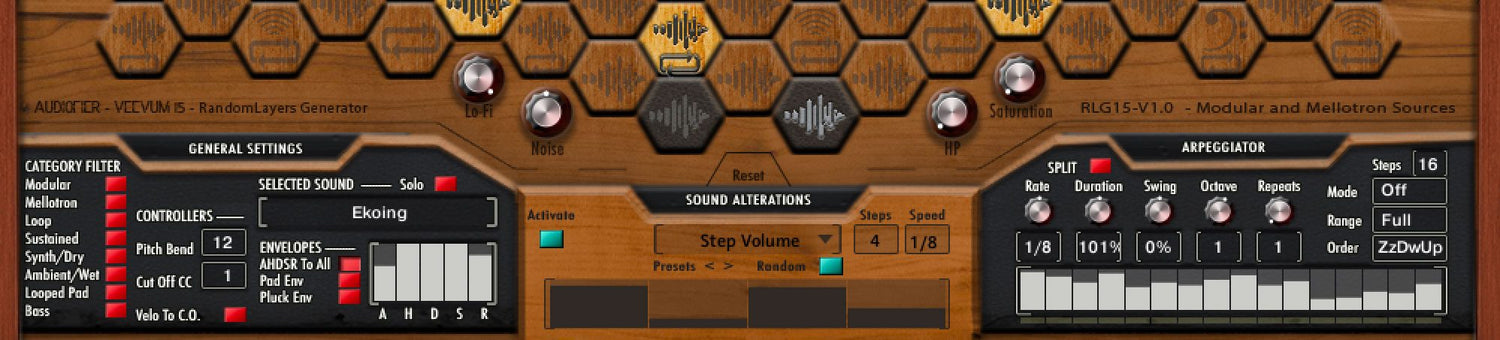 VEEVUM verfügt über einen Arpeggiator, der in Verbindung mit dem RANDOM-Spielmodus Sequenzen von Noten generiert, die jedes Mal unterschiedliche Klänge auslösen. Außerdem bietet VEEVUM Step Volume und Step Filter-Effekte.