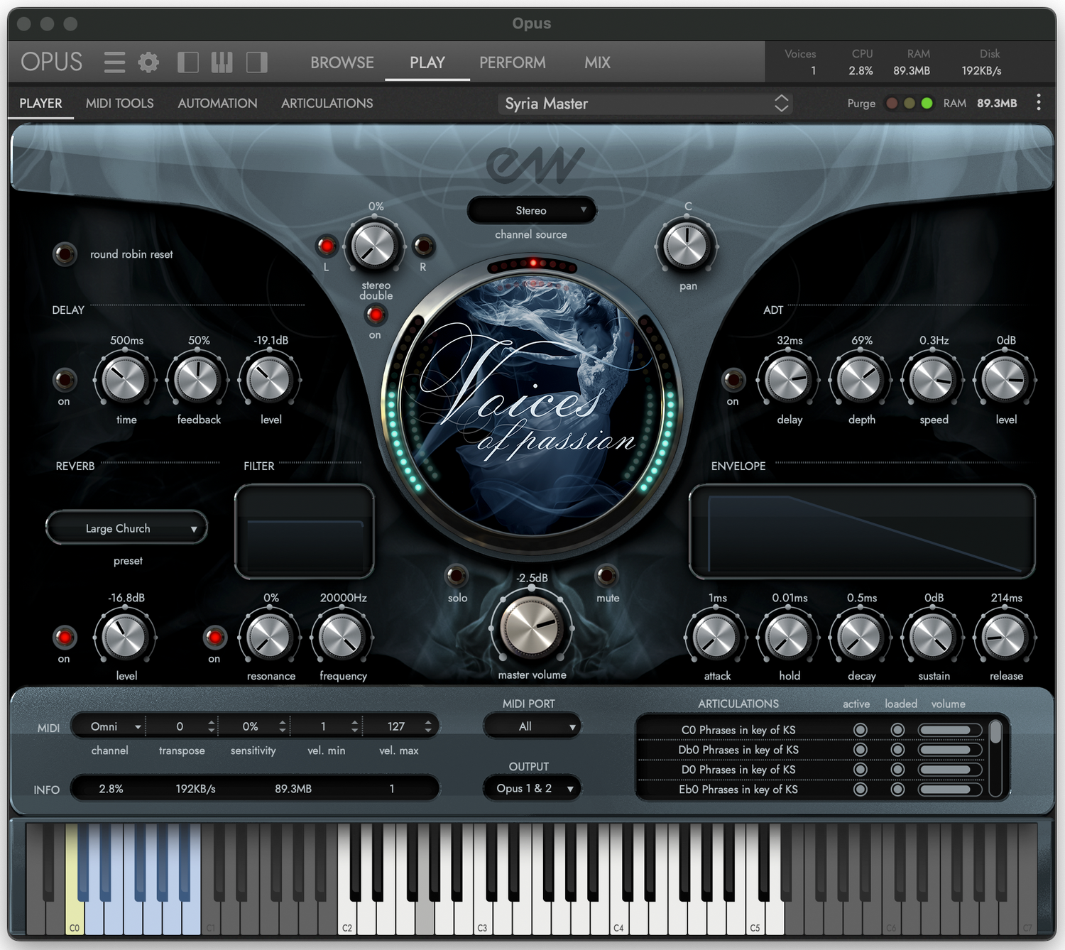 VOICES OF PASSION ist das erste virtuelle Instrument, das echte legato Intervalle bietet (nur amerikanisch und walisisch). Die mittelöstlichen und indischen Phrasen werden in einem Baukastenformat präsentiert, das es den Benutzern ermöglicht, sehr lange konsistente Aufführungen zu erstellen. Mod-Wheel-Steuerungen bestimmen den Einstiegspunkt bei ethnischen Phrasen.