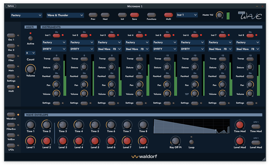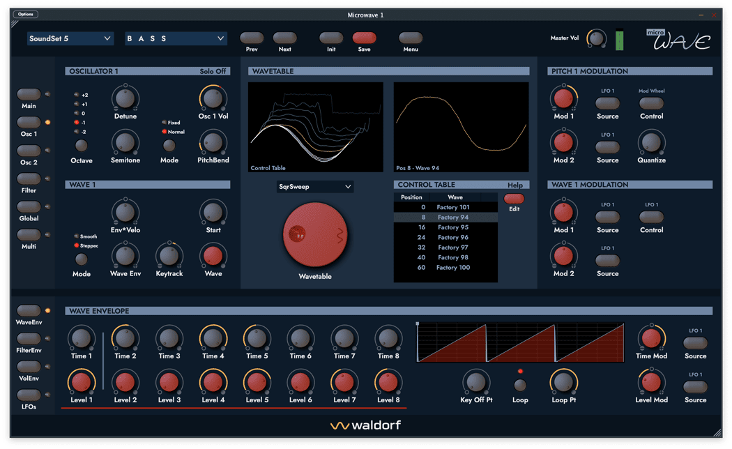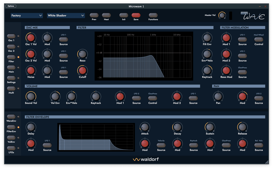 Nur die 1. Generation der Microwave und auch die Waldorf Wave basierten auf einem maßgeschneiderten integrierten Schaltkreis namens Waldorf ASIC. In Kombination mit den legendären Curtis-Filterchips und einer sehr einzigartigen 68k-CPU-basierten Steuerungssoftware definierte der ASIC einen ganz besonderen Geschmack von Wavetable-Sound, der unvergleichlich ist. Niemand anderes als der Erfinder der Wavetable-Synthese der achtziger Jahre, Wolfgang Palm, half bei der Gestaltung dieses einzigartigen Chips. Waldorf unternahm große Anstrengungen, um diesen integrierten Schaltkreis innerhalb des Plug-ins zu analysieren und nachzubilden.