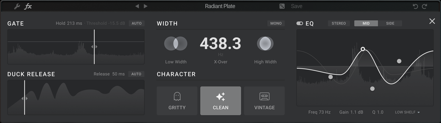 - 4-Band Mid/Side EQ formt die Präsenz und Verbreitung des Halls und sorgt dafür, dass er perfekt in Ihren Mix passt