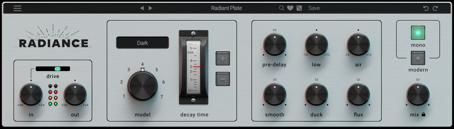 Durch die Kombination von fortschrittlicher hybrider DSP-Modellierung mit leistungsstarken Formungs- und Modulationstools liefert Radiance alles von tiefen, kinoreifen Gesangsnachhall und engen, rhythmischen Drum-Räumen bis hin zu schimmernden Gitarren-Ambientes — alles mit der üppigen Tiefe und dem strahlenden Resonanz eines echten Plattenhalls.