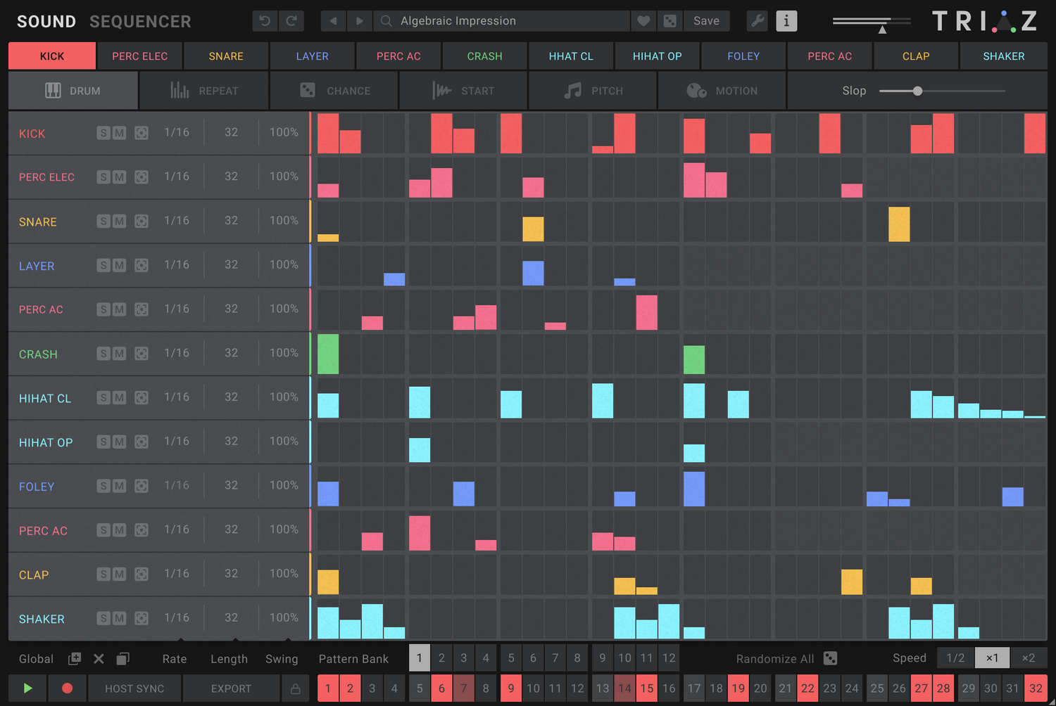 Triaz ist eine Drum-Engine der nächsten Generation, die neu definiert, was in der Beat-Produktion möglich ist. Mit blitzschneller polyrhythmischer Sequenzierung, leistungsstarker Drum-Layering, per-Step-Parameter-Modulation und einer bahnbrechenden Randomisierungs-Engine ermöglicht es Triaz, Ihre Beats mit unvergleichlicher Geschwindigkeit und Tiefe zu erstellen, anzupassen und weiterzuentwickeln.