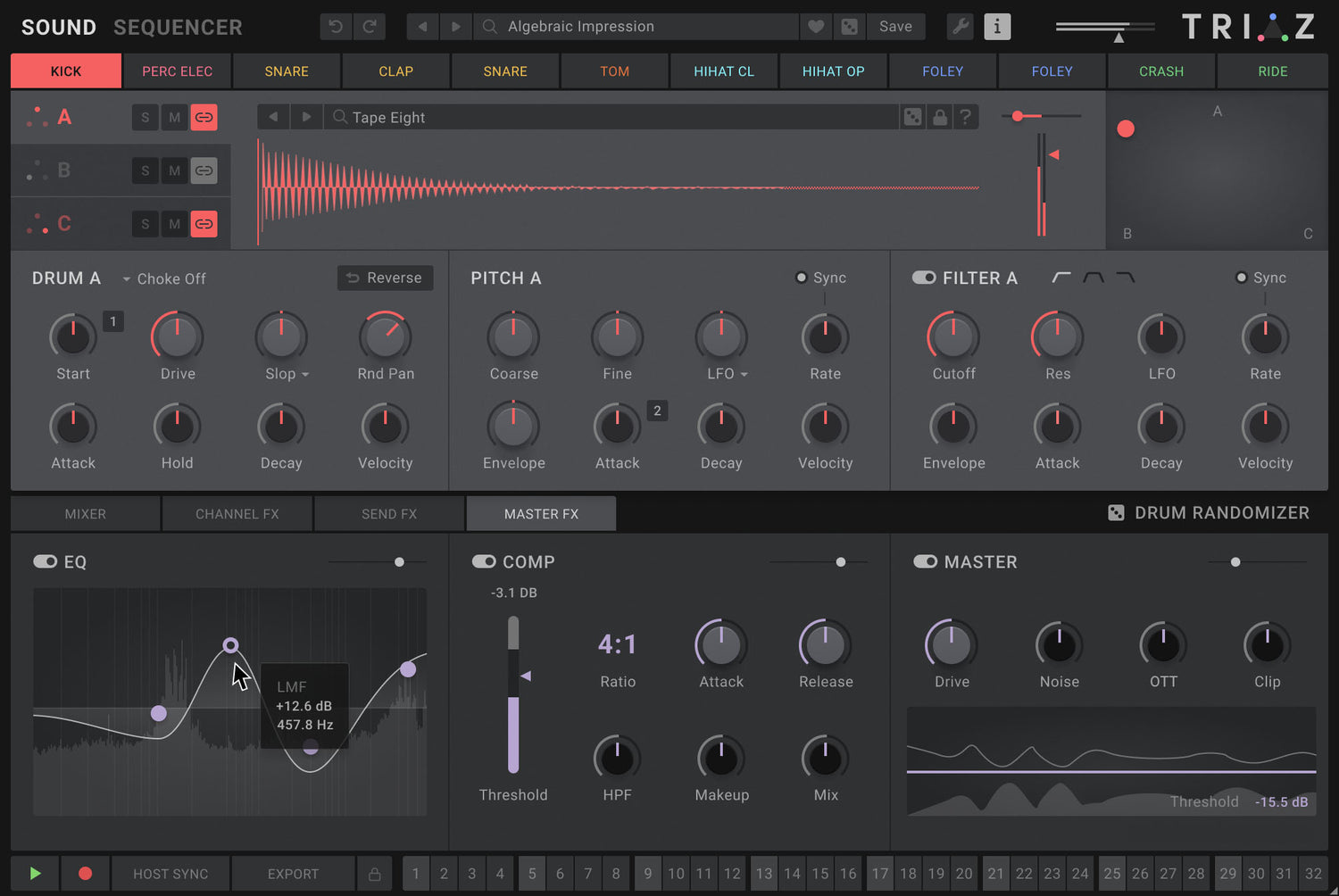 Von sauberem kommerziellen Punch bis hin zu gebrochenem, abstraktem Chaos — Triaz gibt Ihnen die Werkzeuge, den Sound und die Freiheit, jeden erdenklichen Beat zu formen.