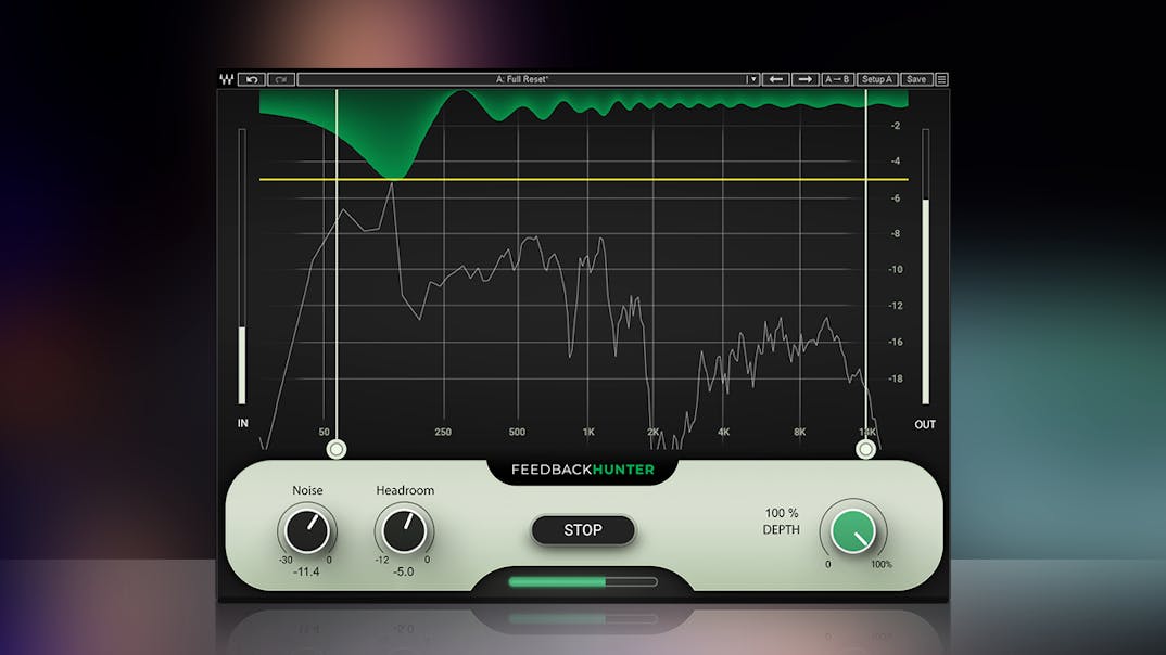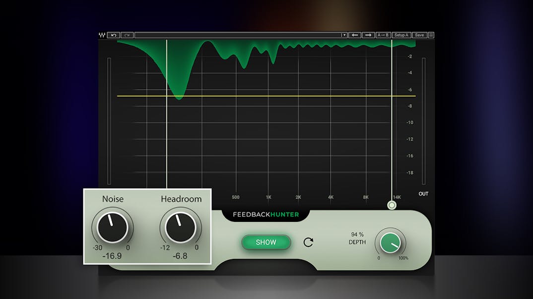 Feedback Hunter bewertet die Mikrofon-Lautsprecher-Interaktionen mit Hilfe von weißem Rauschen und passt seine Feedback-Kontrolle an Ihre spezifische akustische Umgebung an.