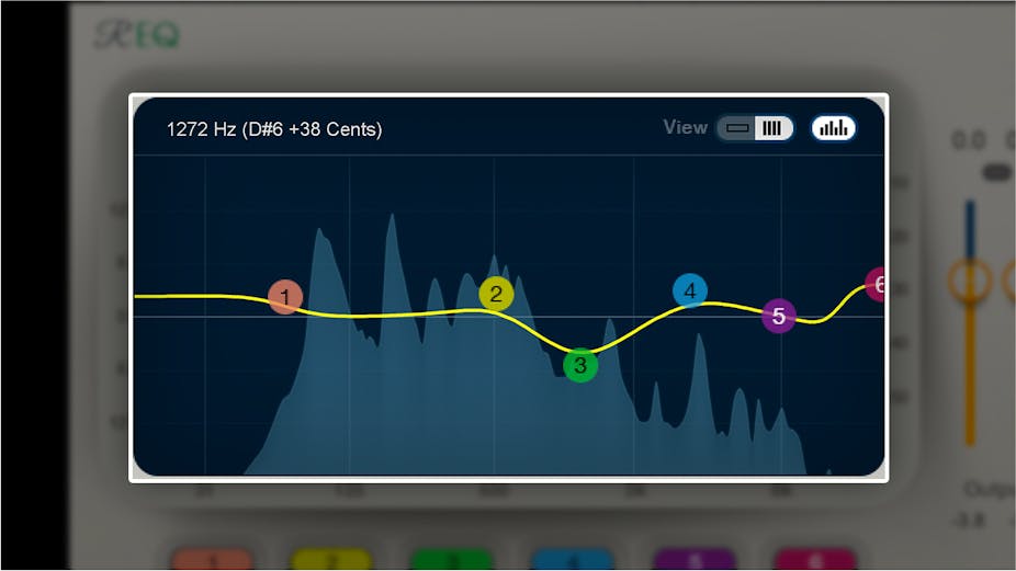 Der Echtzeitanalysator zeigt genau, wie EQ-Anpassungen die Frequenzantwort beeinflussen, aber es gibt noch mehr: Bewegen Sie den Mauszeiger über das Display, und das Display zeigt die Frequenz unter dem Cursor sowohl in Hertz als auch in musikalischen Noten an.