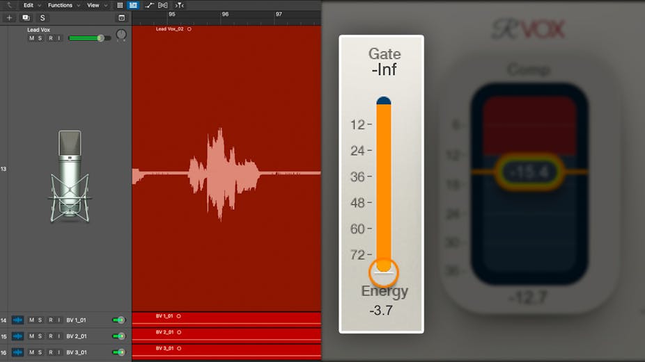 Anstatt ein brutales Gate zu verwenden, um Geräusche loszuwerden, nutzt R-Vox eine sanfte Abwärts-Expansion. Sobald R-Vox erkennt, dass kein Gesang vorhanden ist, sinkt der Ausgang sanft, ist jedoch bereit, sofort wieder anzusteigen, wenn es nötig ist.