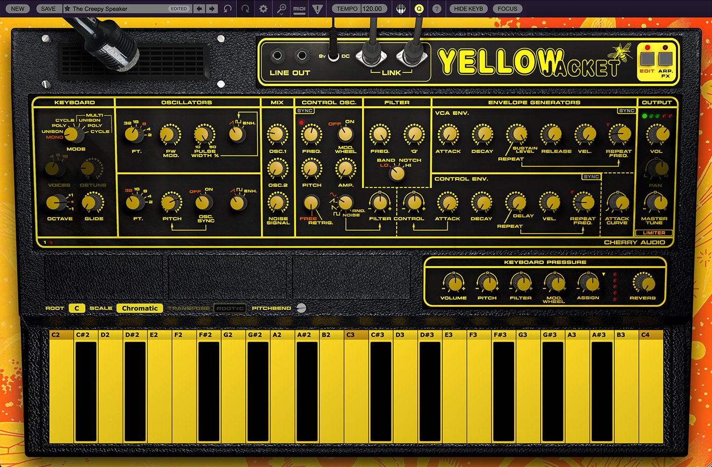 Cherry Audio hat das Aussehen der notorischen berührungsempfindlichen gelb-schwarzen Tastatur des Originals nachgebildet, es mit diatonischen Skalen und Transponierung verbessert und mit anpassbarem Druckkontrolle erweitert, die Unterstützung für ausdrucksstarken Kanal- und polyphonen Aftertouch bietet. Vielleicht ist das aufregendste Merkmal des Yellowjacket direkt inspiriert von EDPs innovativem Pre-MIDI-System, das es ermöglichte, mehrere Synthesizer miteinander zu verbinden: Mehrstimmige Modi, die anpassbare "Mini-Synths" hinzufügen, die subtile oder extreme Variationen im Klang, einfingerige Akkorde und arpeggierte Muster, üppige Stereo-Effekte und mehr bieten können.