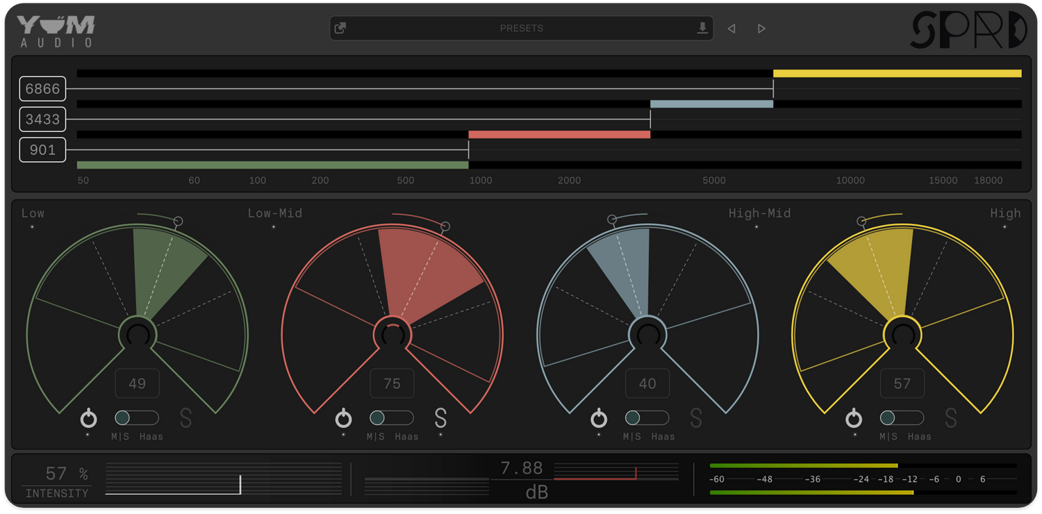 Ein unverzichtbares Werkzeug, um den nächsten Schritt in Ihrer Stereo-Verarbeitung zu machen. Fokussieren Sie auf jede Frequenz und stellen Sie genau deren Breite und Panning ein. Zentrieren Sie Ihre Tracks für mehr Fokus oder schieben Sie sie weit für eine großartige Stereo-Landschaft.